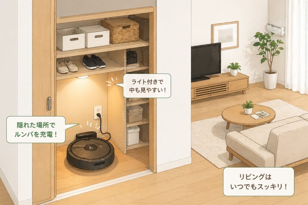 具体的な使い道として多いのが、ロボット掃除機の充電ステーションとしての活用です。収納内にルンバを格納しつつ充電できるため、リビングにコードが転がらずスッキリします。そのほかWi-Fiルーターの設置場所や、間接照明の電源としても重宝します。