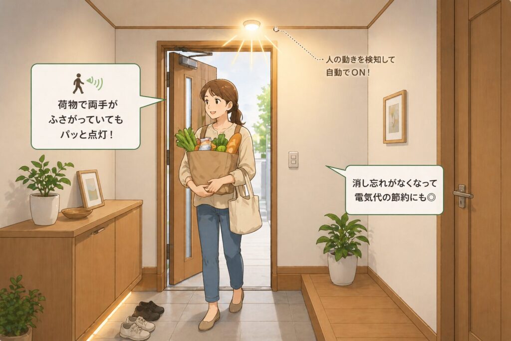 玄関は買い物帰りに両手がふさがっていてもパッと点灯してくれます。トイレは子どもの消し忘れ問題が自然に解決します。「使いたいときだけ手動に切り替えられる」機能もあるため、デメリットはほぼありません。コスパで考えると最も費用対効果の高いオプションのひとつです。
