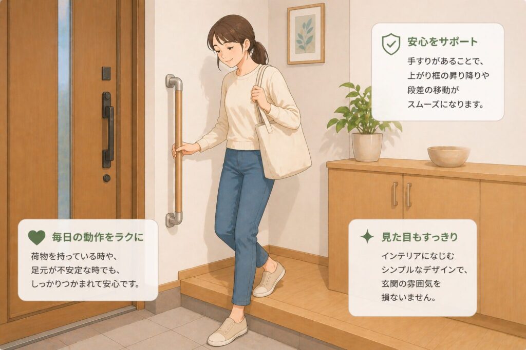 玄関と浴室に設置。高齢の親が来たとき「これがあると安心」と言っていました。若いうちから自分自身も使うようになっており、特に浴室の手すりは滑り防止として毎日活躍しています。
