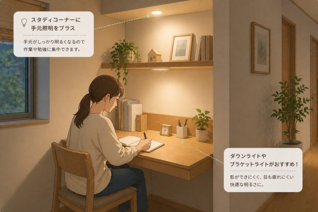 解決策は、設計段階でスタディコーナーの真上または手元付近に専用のダウンライトを追加しておくことです。コストは1か所あたり数千円程度でありながら、毎日使う場所だけに費用対効果は高いです。