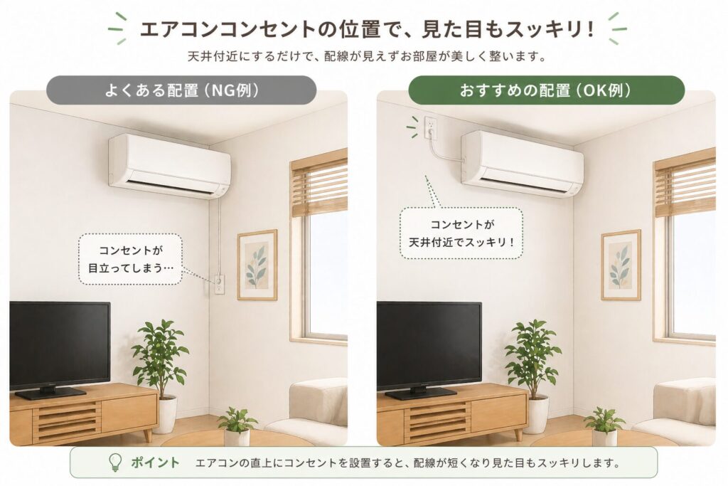 コンセントを天井に近い位置(天井付近の壁)に変更するだけで、室内がグッとスッキリします。エアコン本体の直上にコンセントがくるため配線も短くなり、インテリアを邪魔しません。担当者に確認しないと標準位置のまま進んでしまうことが多いので、打ち合わせ時に積極的に要望を出すことが大切です。