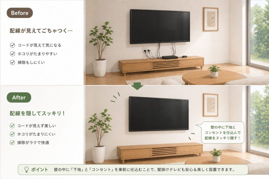 「壁掛けにするかどうかまだ決めていない」という方こそ入れておくべきオプションです。下地とコンセントを仕込んでおけば、入居後に壁掛けにするかどうか後から判断できます。入れなかった場合、後付けで下地工事をするのは大規模工事になることも。