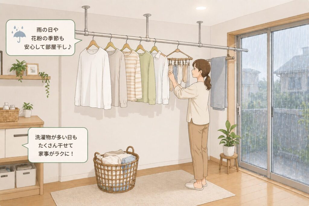天井から吊り下げる室内干しポール(ホスクリーンなど)は、「1か所あればいい」と思って後悔するオプションの代表格です。使ってみると、梅雨・花粉シーズン・ゲリラ豪雨・PM2.5が多い日など、外干しできない日が思いのほか多いことに気づきます。