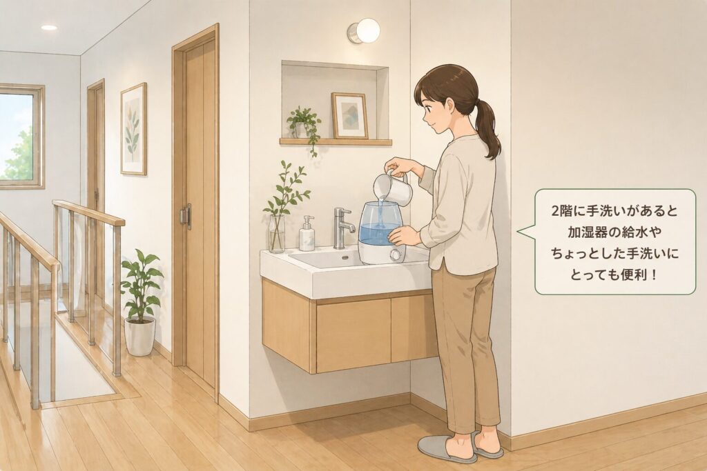 使ってみると意外な場面で活躍します。加湿器の給水・除湿機の排水が2階で完結するようになるのは特に便利で、冬場の加湿器シーズンに実感が大きいです。また、朝の洗顔や手洗いが1・2階で分散されるため、家族が多い朝の混雑緩和にもつながります。